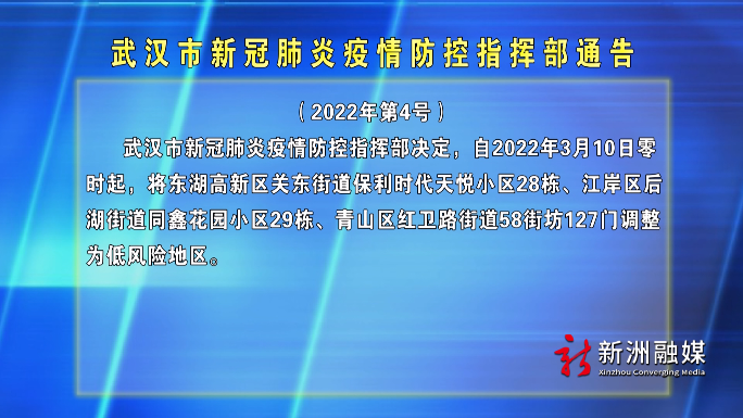 武汉市新冠肺炎疫情防控指挥部决定,自2022年3月10日零时起,将东湖高新区关东街道保利时代天悦小区28栋、江岸区后湖街道同鑫花园小区29栋、青山区红卫路街道58街坊127门调整为低风险地区。