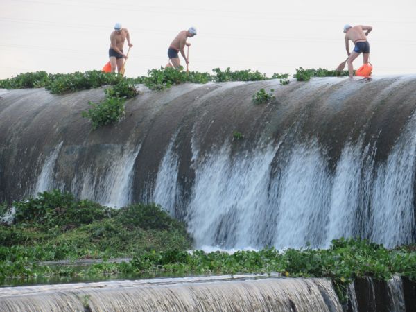 在举水河邾城街河段的橡胶坝上,3名游泳爱好者正在全力推下挡住河流的一大片水葫芦,晨曦中,他们的环保义举,引来众多晨练者的点赞。