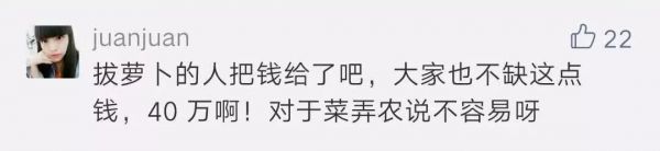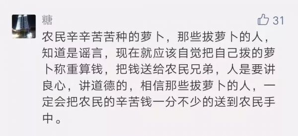 热心网友看到报道后,专门在这些视频中留言,解释事情原委,呼吁薅萝卜的人能将萝卜钱还给菜农。