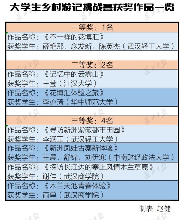 11月29日下午,2019·第二届武汉市乡村旅游节大学生乡村游记挑战赛举行颁奖仪式。此次大赛由武汉市文化和旅游局主办,长江日报城市运营研究院、湖北腾旅科技和湖北云游楚天旅游直通车公司承办,围绕“武汉乡村旅游”为主题,集中展示武汉乡村旅游看点与特色风貌,展示乡村振兴成果。来自华中师范大学、中南财经政法大学、湖北大学、武汉轻工大学、武汉商学院、江汉大学等10多所高校的大学生参赛。在海选投票阶段,总计有13万选票,为500多个作品进行了投票。最终根据投票成绩和专家评审,决出一二三等奖。其中一等奖一名,二等奖两名,三等奖四名。