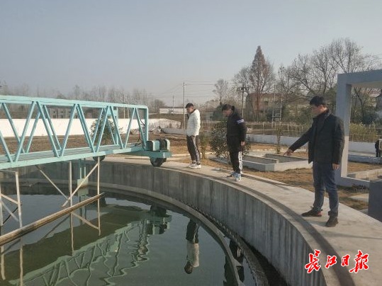 市生态环境局新洲区分局生态科负责人朱方在沉淀池,将一根长木棍深入水中,两米之内清晰可见。他介绍,出水可达一级A标准。